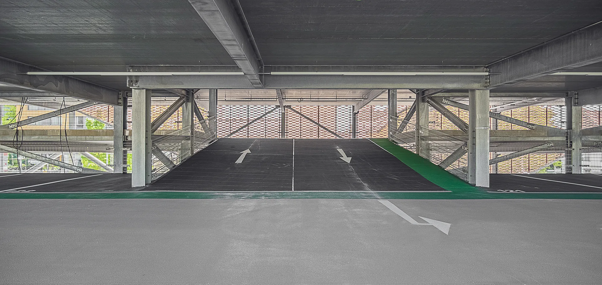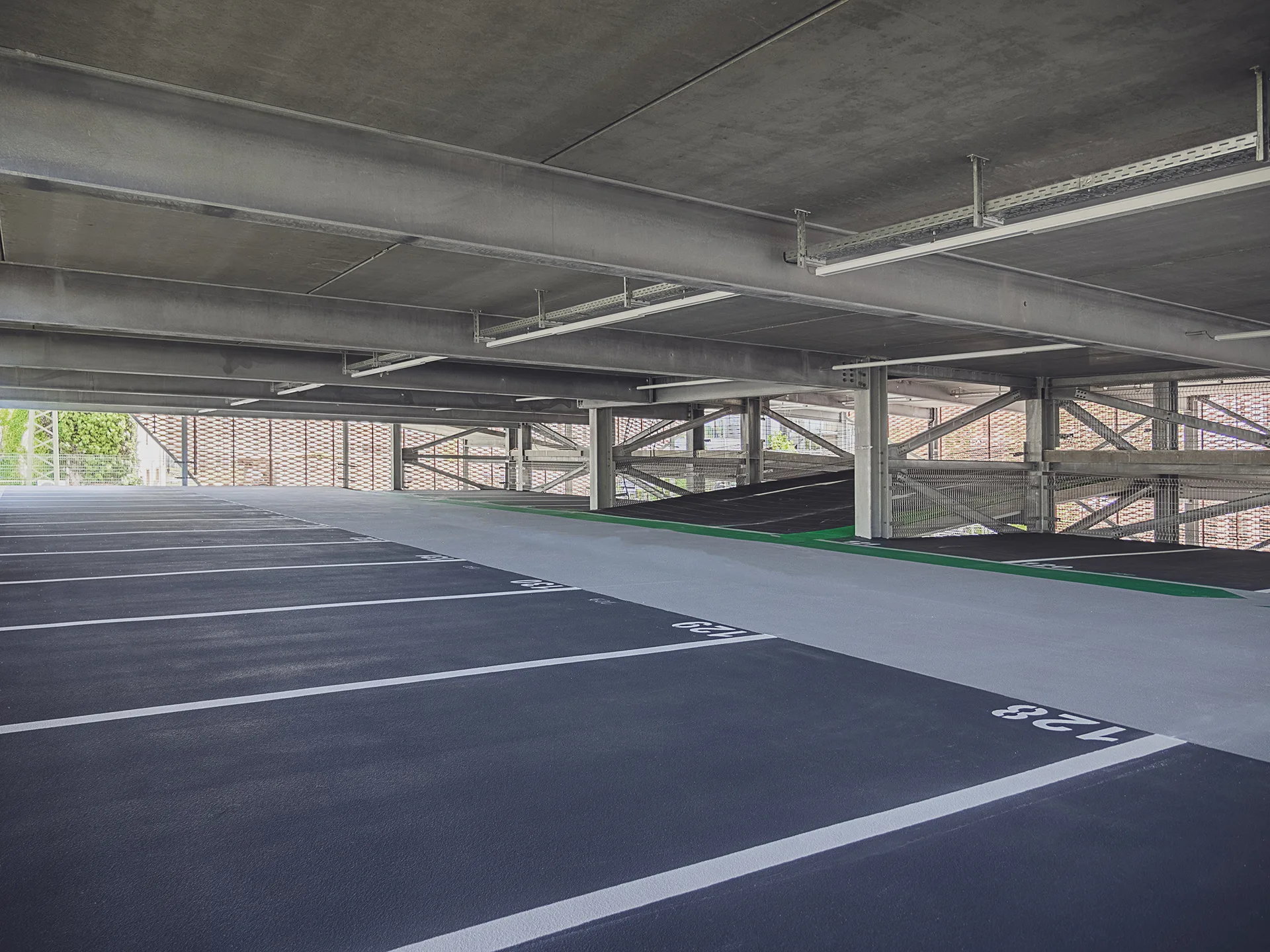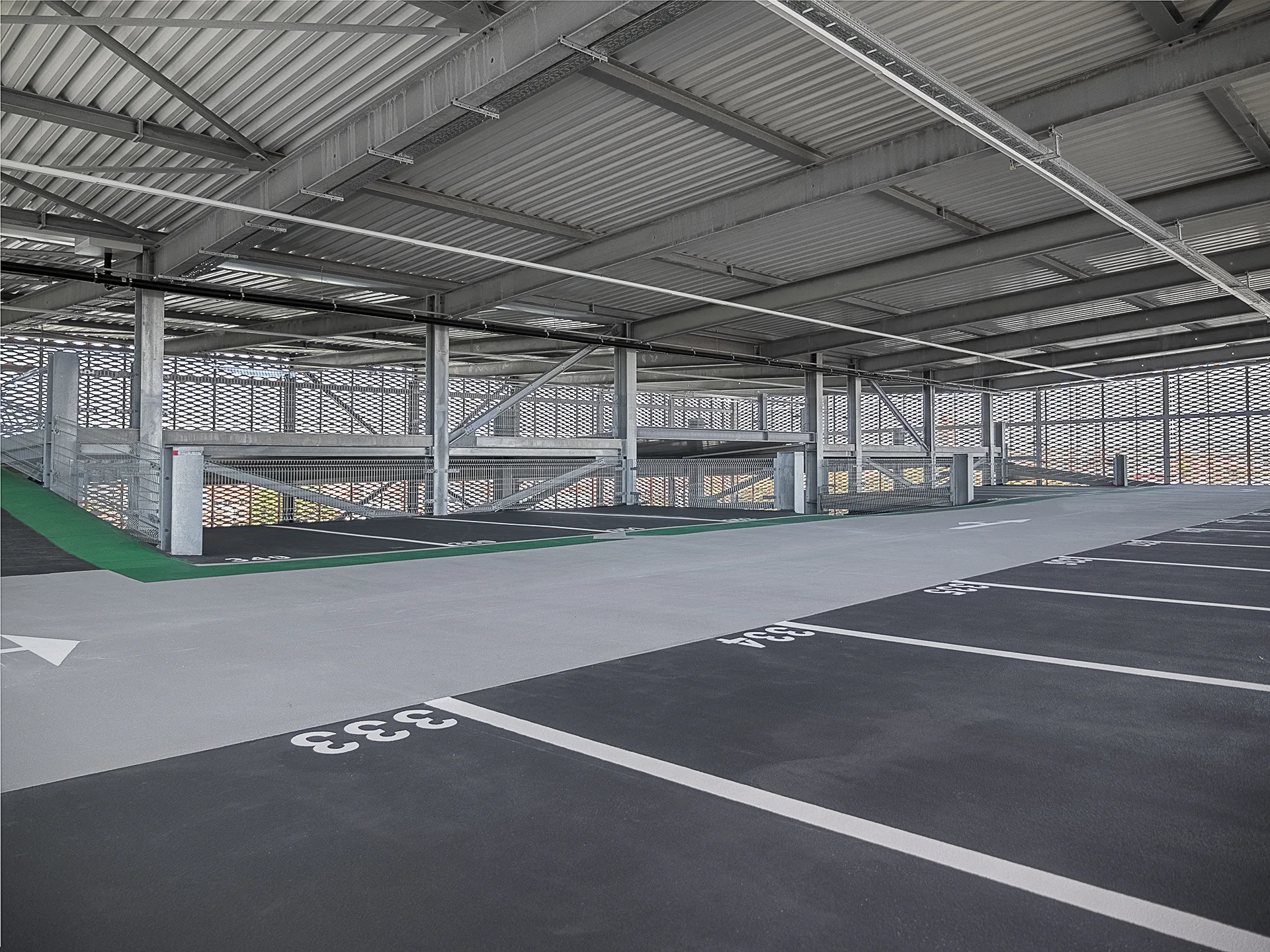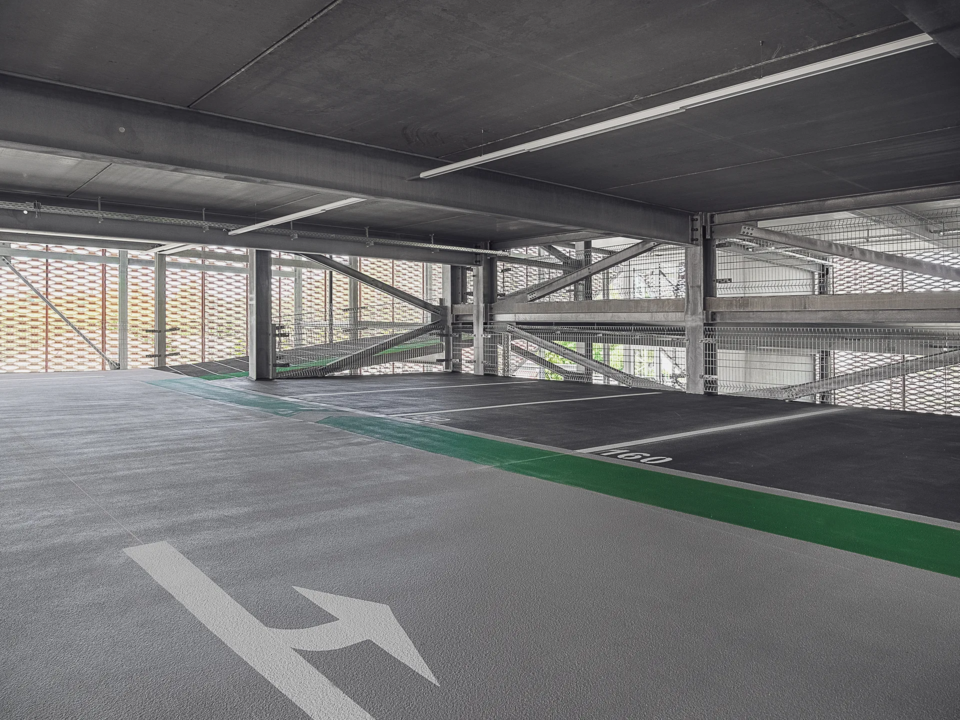 In der Julius-Bührer-Str. 1 in Singen wurde das bestehende Parkhaus abgerissen und ein neues Parkhaus mit erhöhter Stellplatzanzahl und moderner Parkierungsgeometrie und -gestaltung errichtet. Das Parkhaus verfügt neu 382 Stellplätze auf circa 9.900 m² Fläche. Die Struktur wurde in Stahlverbundbauweise hergestellt. Die Erschließung der Splittlevel erfolgt im D´Humy-System. Die schlanken Geschossdecken, Rampen und die Bodenplatten der unteren Ebenen mussten zur Sicherstellung der Dauerhaftigkeit mit einem Oberflächenschutzsystem versehen werden. Gemäß Aufgabenstellung lag das Hauptaugenmerk auf der Minimierung der Lebenszykluskosten. Weswegen auf die Performence der Oberflächenschutzysteme größten wert gelegt wurde. Zu unserer Aufgabestellung gehörte zudem die Erstellung eines Farbkonzeptes, das sowohl eine übersichtliche Einteilung der Geschossebene in Fahrgassen und Parkplätze schafft als auch ein Personenleitsystem zu den Treppenhauskernen integriert.