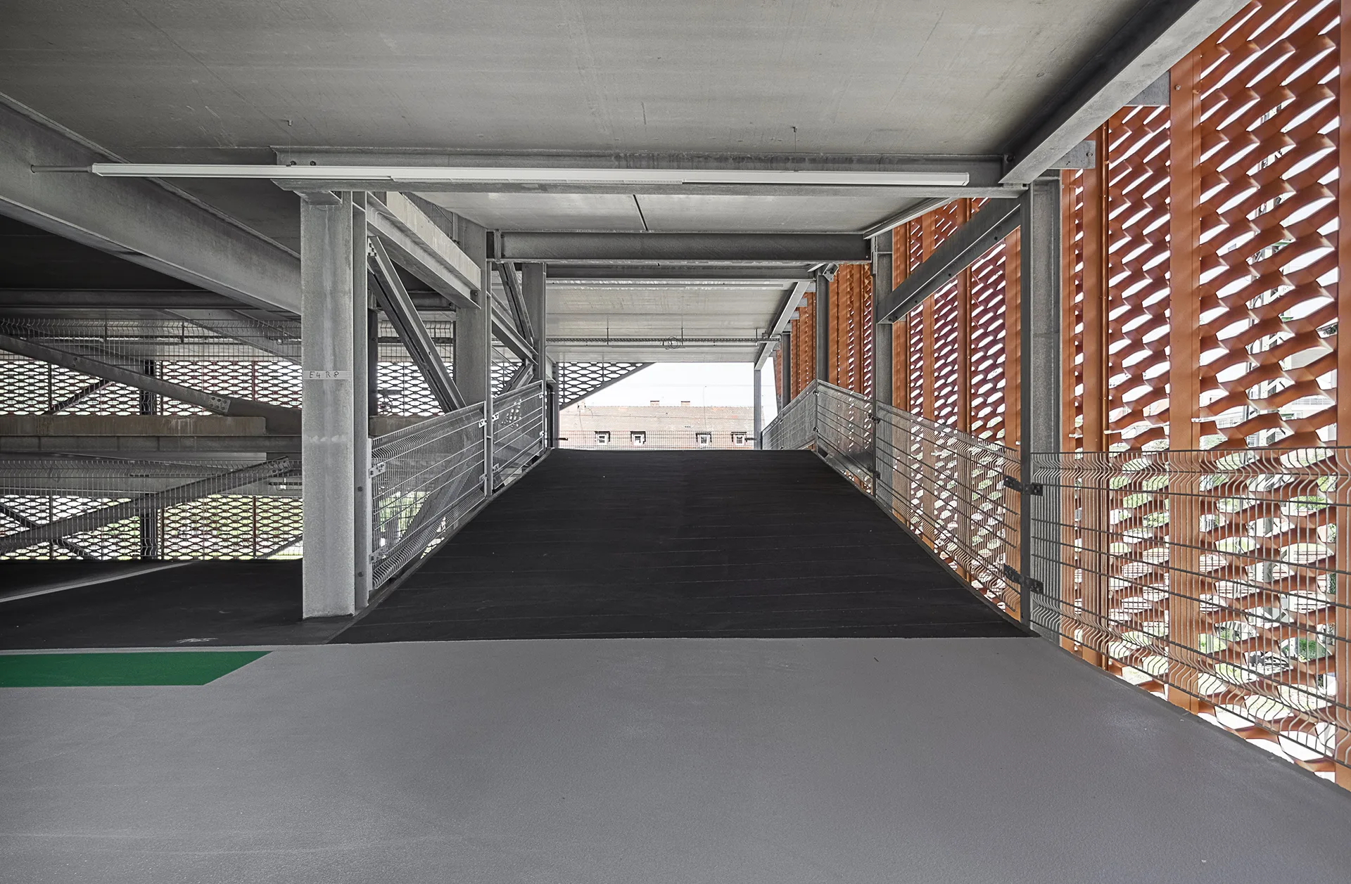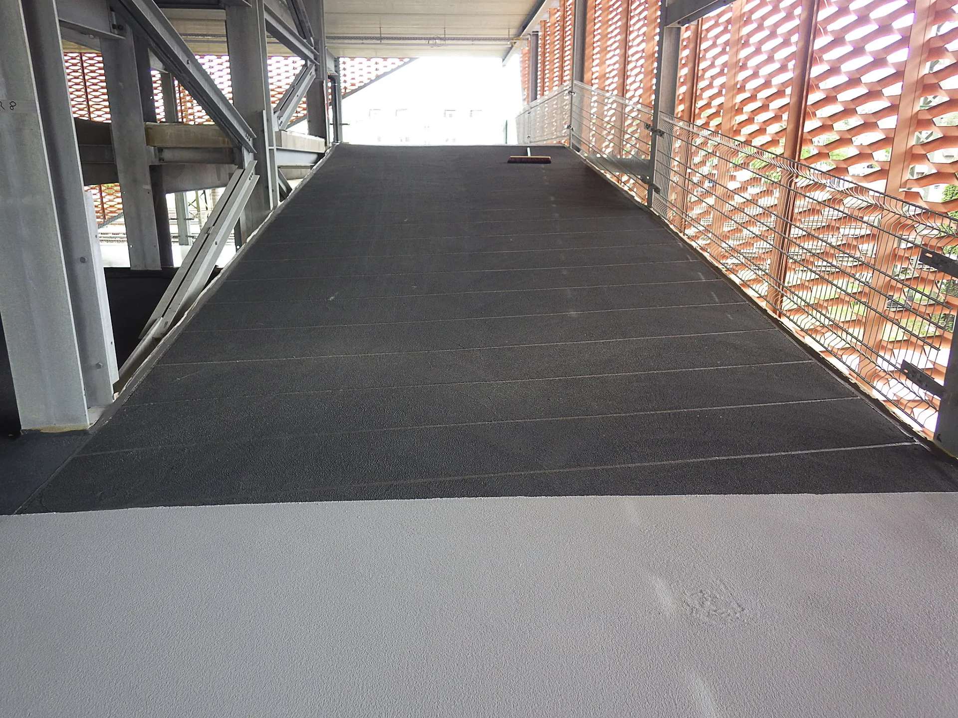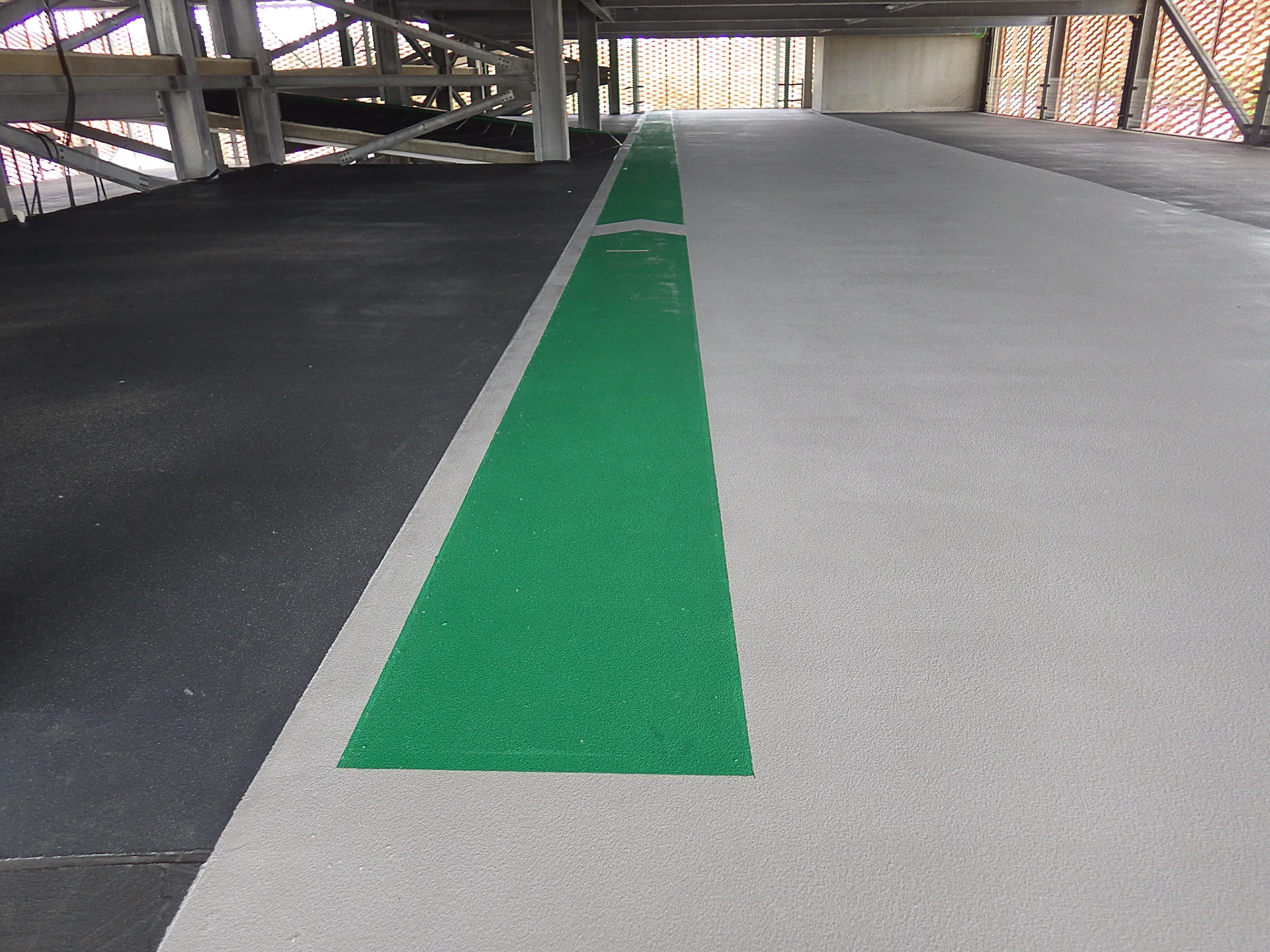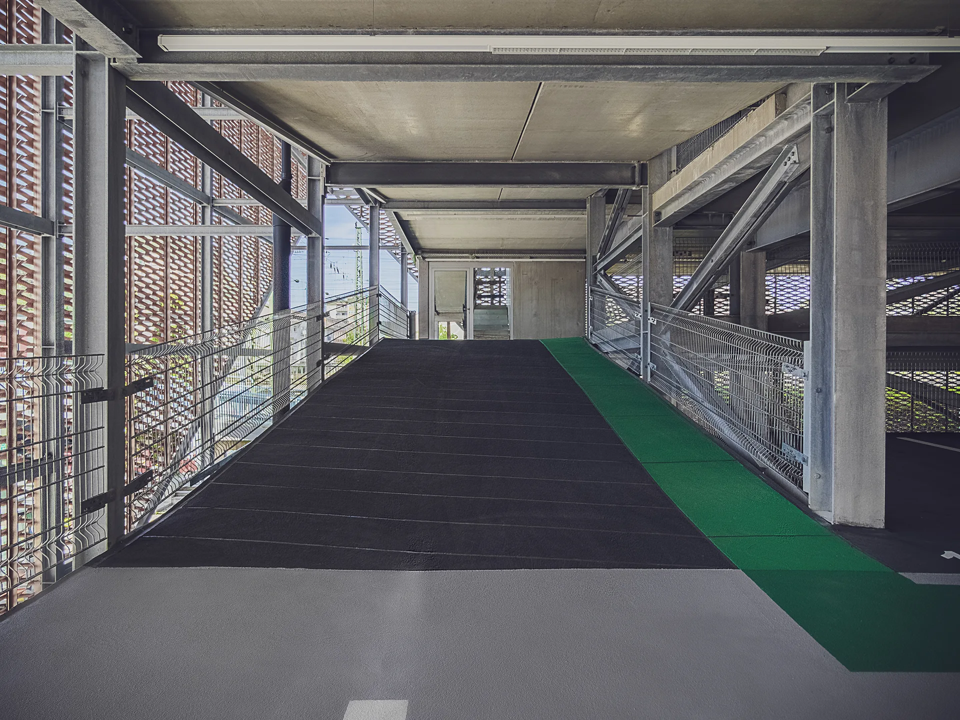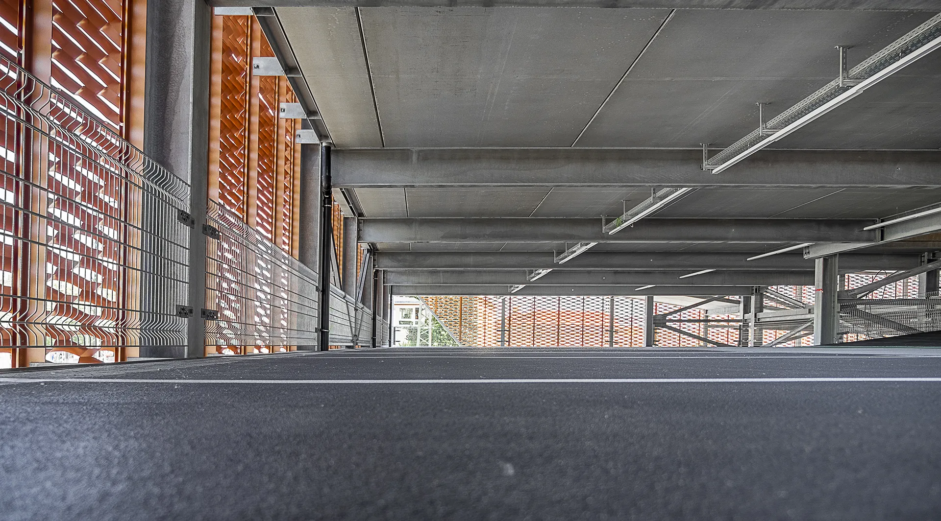 In der Julius-Bührer-Str. 1 in Singen wurde das bestehende Parkhaus abgerissen und ein neues Parkhaus mit erhöhter Stellplatzanzahl und moderner Parkierungsgeometrie und -gestaltung errichtet. Das Parkhaus verfügt neu 382 Stellplätze auf circa 9.900 m² Fläche. Die Struktur wurde in Stahlverbundbauweise hergestellt. Die Erschließung der Splittlevel erfolgt im D´Humy-System. Die schlanken Geschossdecken, Rampen und die Bodenplatten der unteren Ebenen mussten zur Sicherstellung der Dauerhaftigkeit mit einem Oberflächenschutzsystem versehen werden. Gemäß Aufgabenstellung lag das Hauptaugenmerk auf der Minimierung der Lebenszykluskosten. Weswegen auf die Performence der Oberflächenschutzysteme größten wert gelegt wurde. Zu unserer Aufgabestellung gehörte zudem die Erstellung eines Farbkonzeptes, das sowohl eine übersichtliche Einteilung der Geschossebene in Fahrgassen und Parkplätze schafft als auch ein Personenleitsystem zu den Treppenhauskernen integriert.